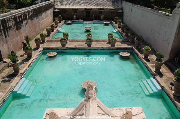 "Dari atas Gapura Panggung ini Sultan biasa menyaksikan tari-tarian di bawah sana. Bangunan-bangunan di sampingnya merupakan tempat para penabuh dan di tengah-tengah biasa didirikan panggung tempat para penari menunjukkan kepiawaian dan keluwesan mereka," terang seorang pemandu ketika YogYES memasuki Taman Sari. Dari Gapura Panggung, pemandu membawa YogYES masuk ke area yang dulunya hanya diperbolehkan untuk Sultan dan keluarganya, kolam pemandian Taman Sari. Gemericik air langsung menyapa. Airnya yang jernih berpadu apik dengan tembok-tembok krem gagah yang mengitarinya. Kolam pemandian di area ini dibagi menjadi tiga yaitu Umbul Kawitan (kolam untuk putra-putri Raja), Umbul Pamuncar (kolam untuk para selir), dan Umbul Panguras (kolam untuk Raja).